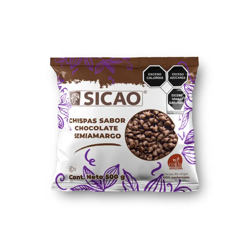 Cobertura sabor chocolate en chispas. Es un sucedáneo sabor chocolate semiamargo (no requiere temperado).